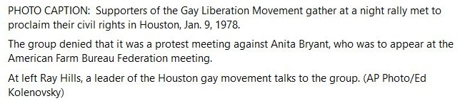 Welcome to Houston LGBT History, which embodies my gay agenda of getting our history online. My approach is to compile information on many aspects of our culture, culled from our publications and coupled with photos and videos when available, and lots more. And there's quite a bit of history items from Austin, Dallas, Fort Worth and San Antonio...and the rest of Texas and beyond on these pages...I just can't help myself.... |