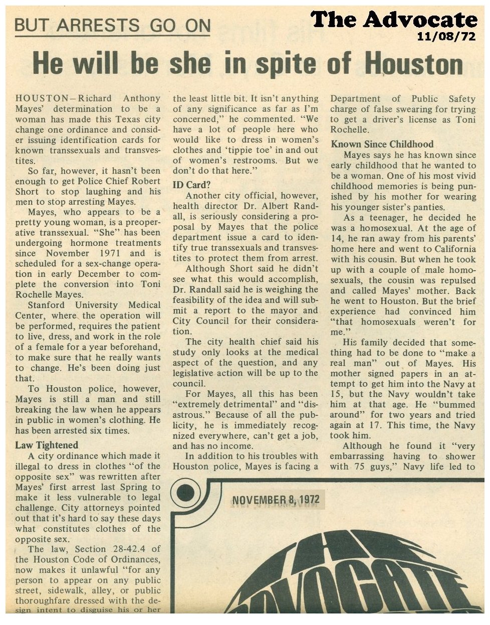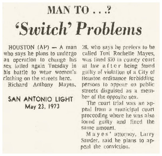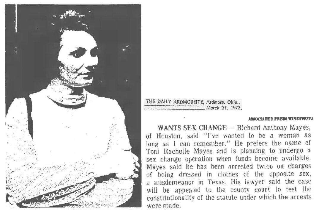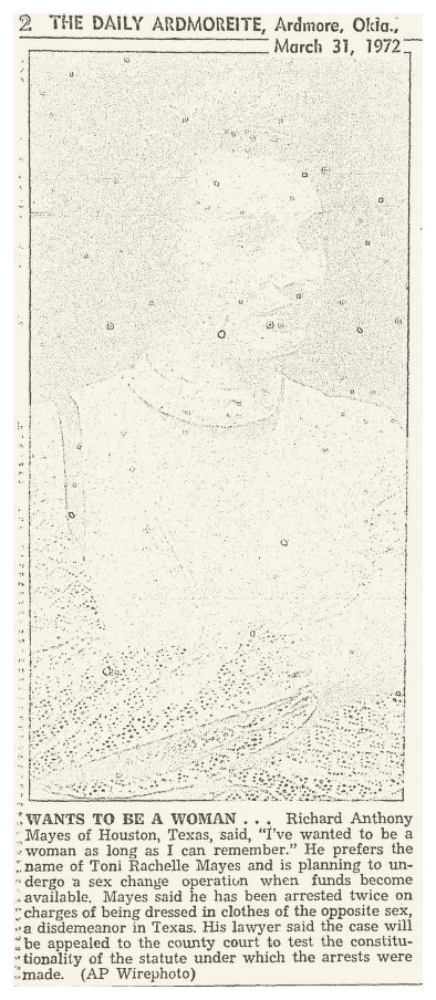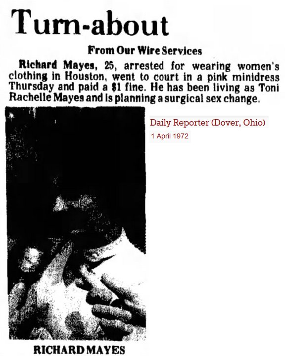 next, the battle shifted from women wearing mens pants to transwomen wanting to dress as women Richard Anthony Mayes = Toni Rachelle Mayes