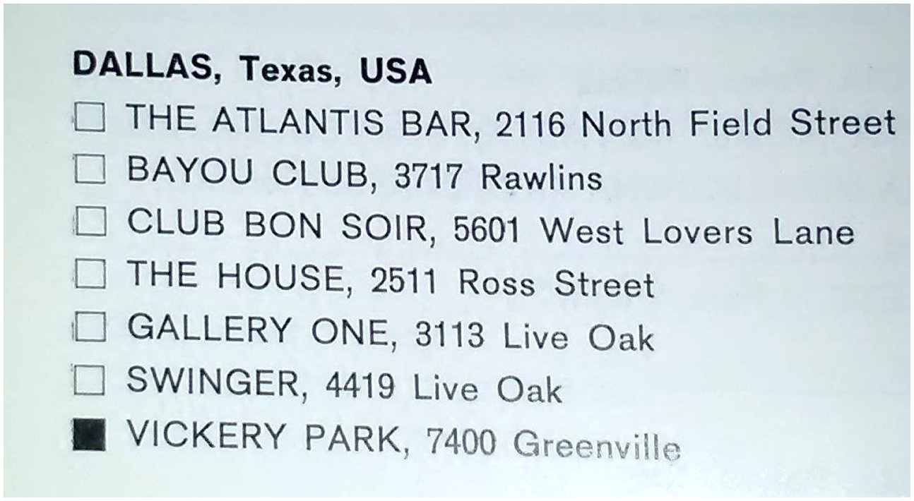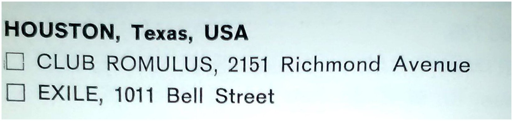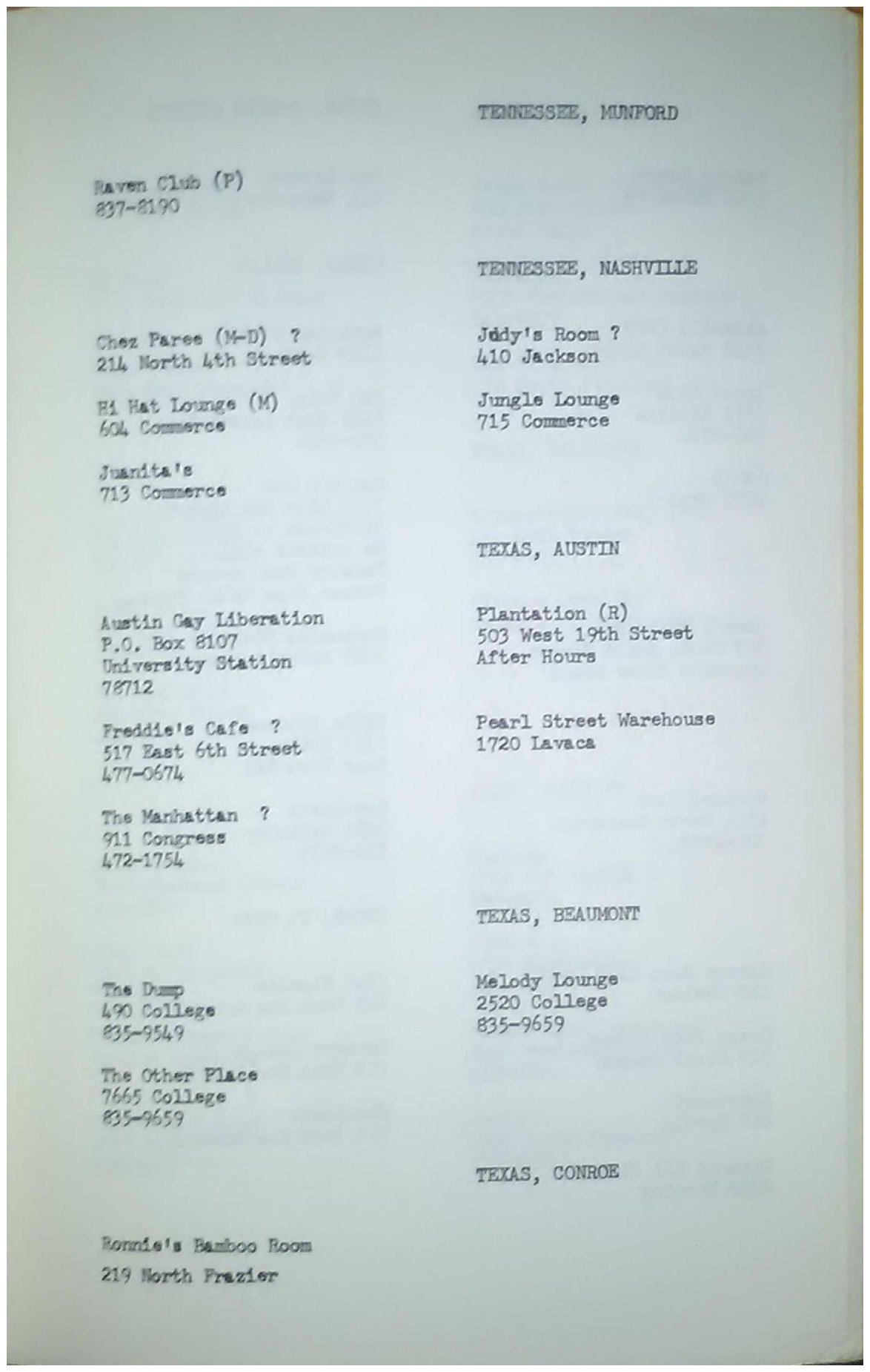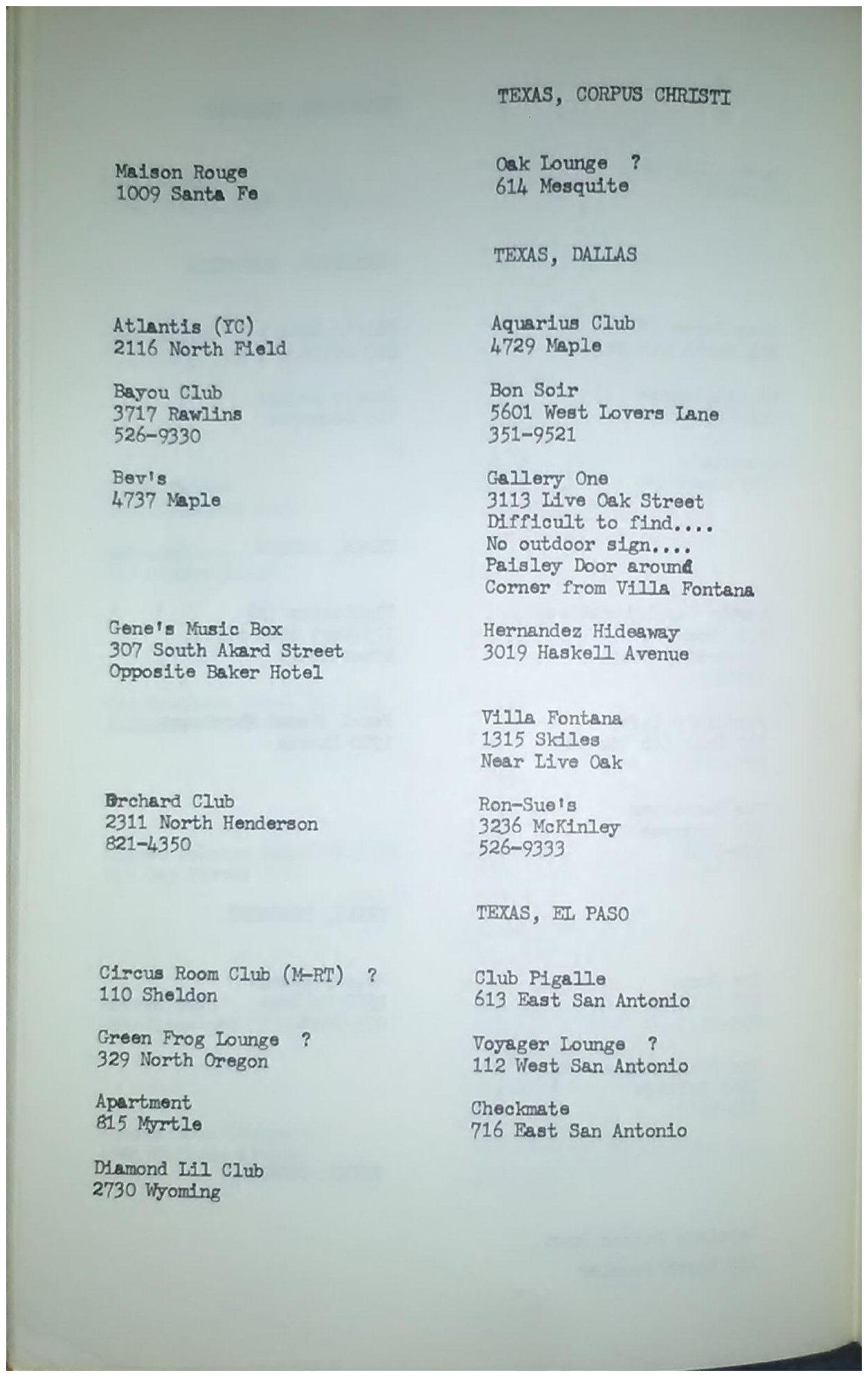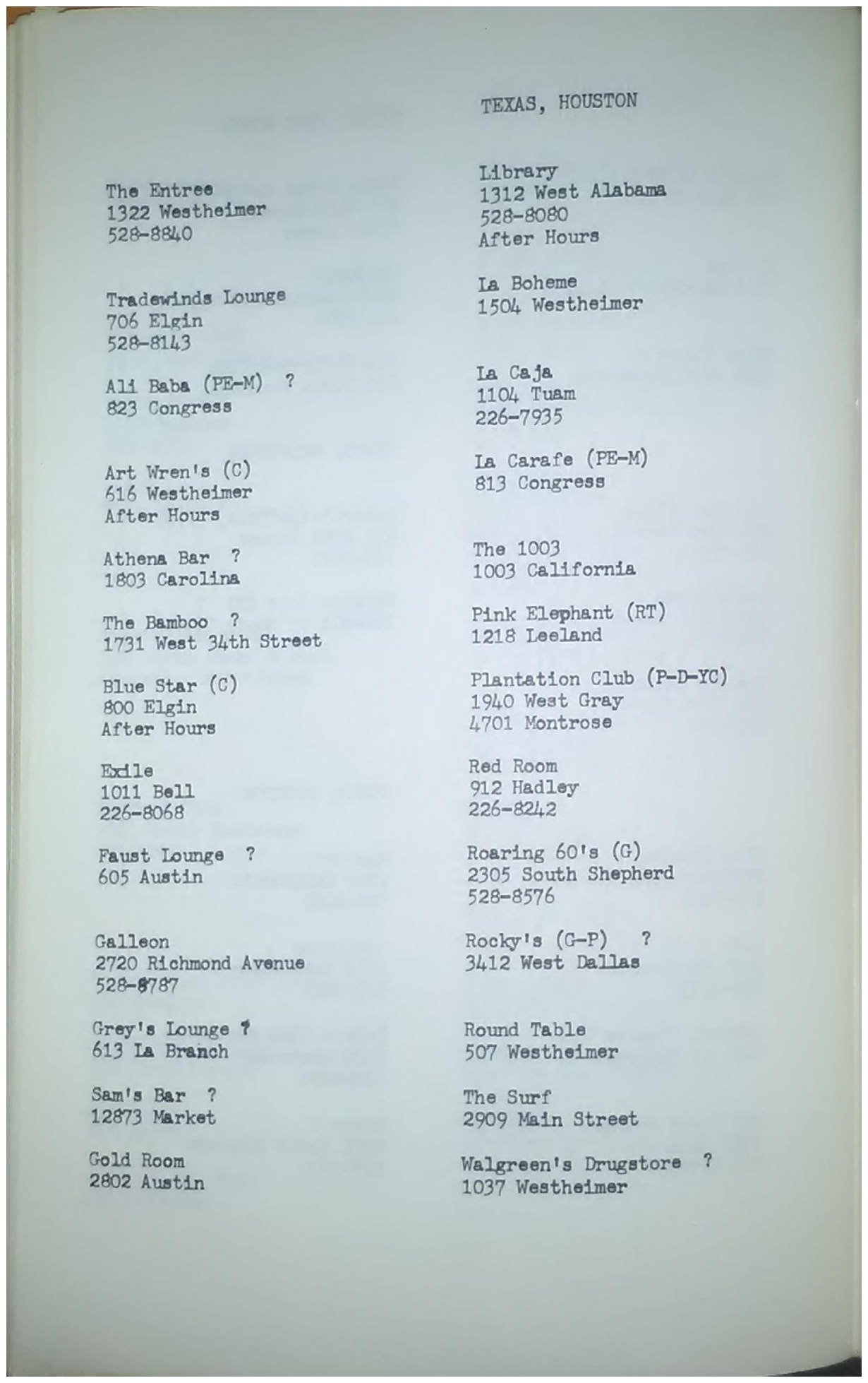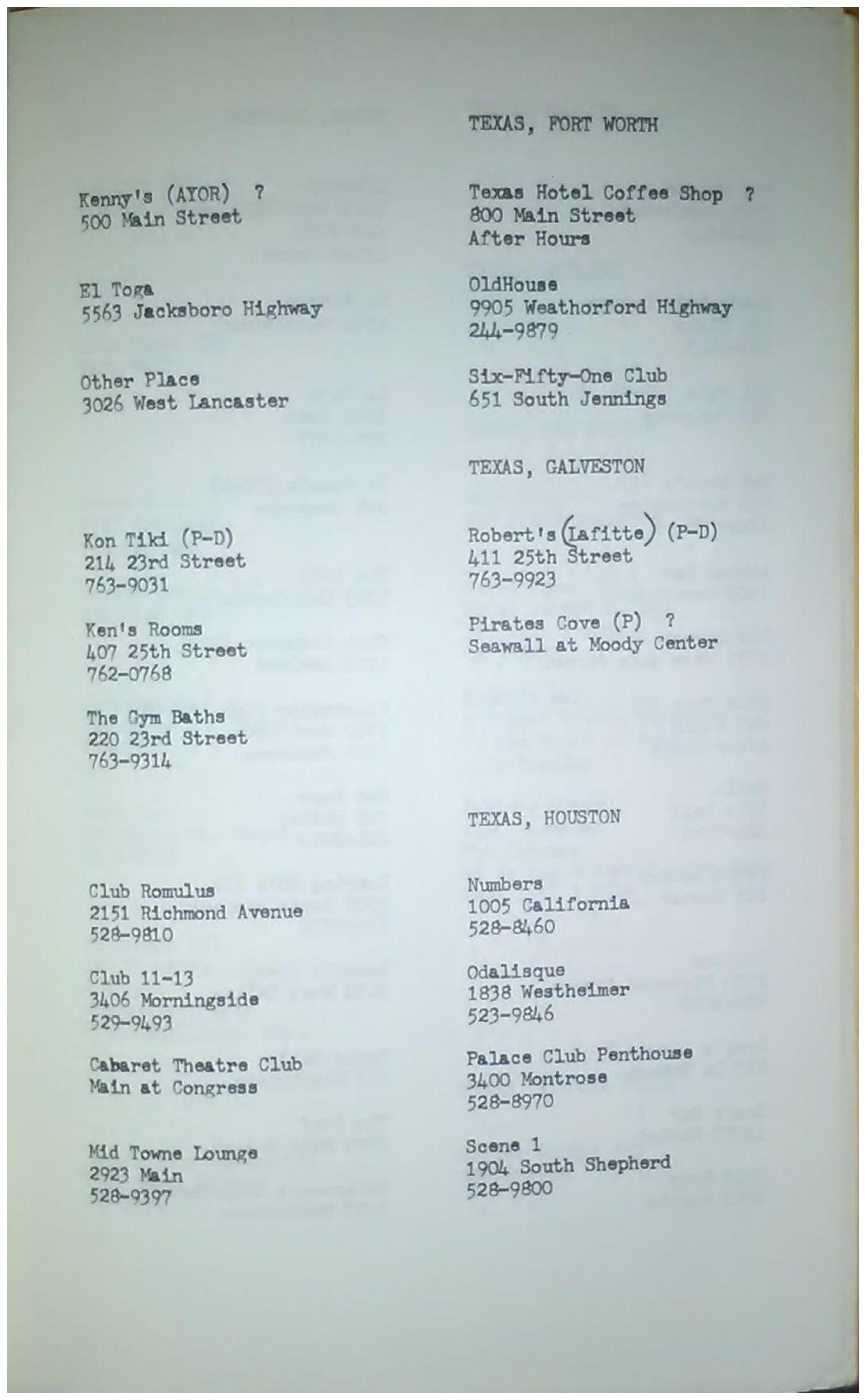 Texas Bars, Businesses, Etc from The Timely Gay Guide (1971), The Gay Insider (1972), & Eos (Denmark, 1972) Courtesy of Luca Luciani (Rome)