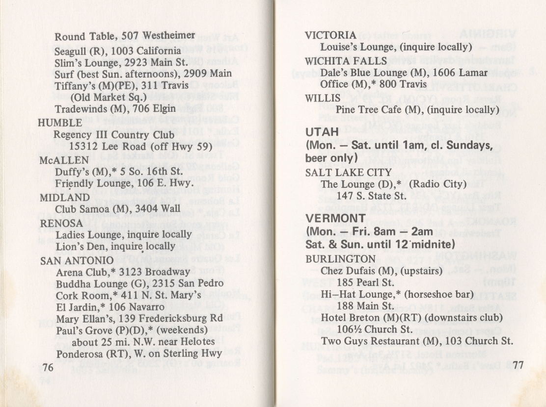 Texas Bars, Baths, Etc from Bob Damron's Address Book 1968 to 1972