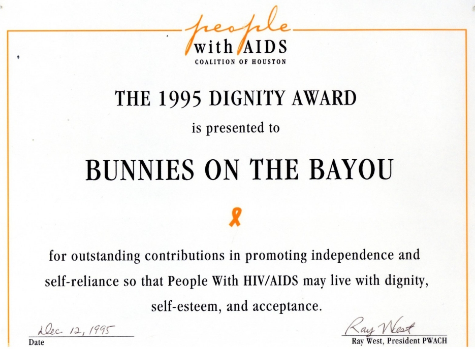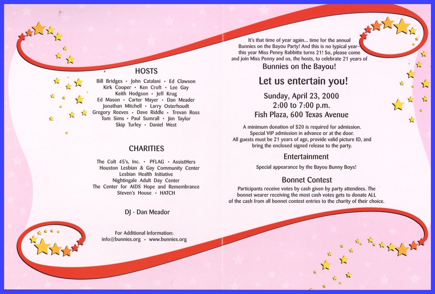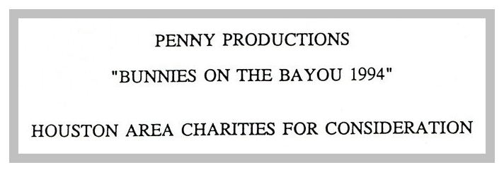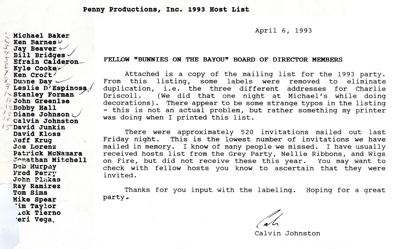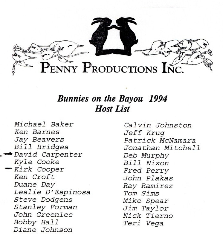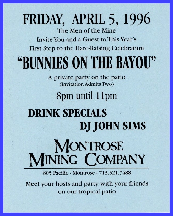 So, here's my history theory... There was a birthday party on Easter Sunday in 1979 at an apartment complex on W Clay. They began having annual parties. In 1981 a group of friends threw a party on Easter they called 'Bunny Fuck,' held for several years. Circa 1984 the first group contacted the second one and got consent to call their party 'Bunny Fuck.' The (private) party was held under that name through 1991. Name changed to Bunnies on the Bayou for 1992, and the group incorporated in 1995. |