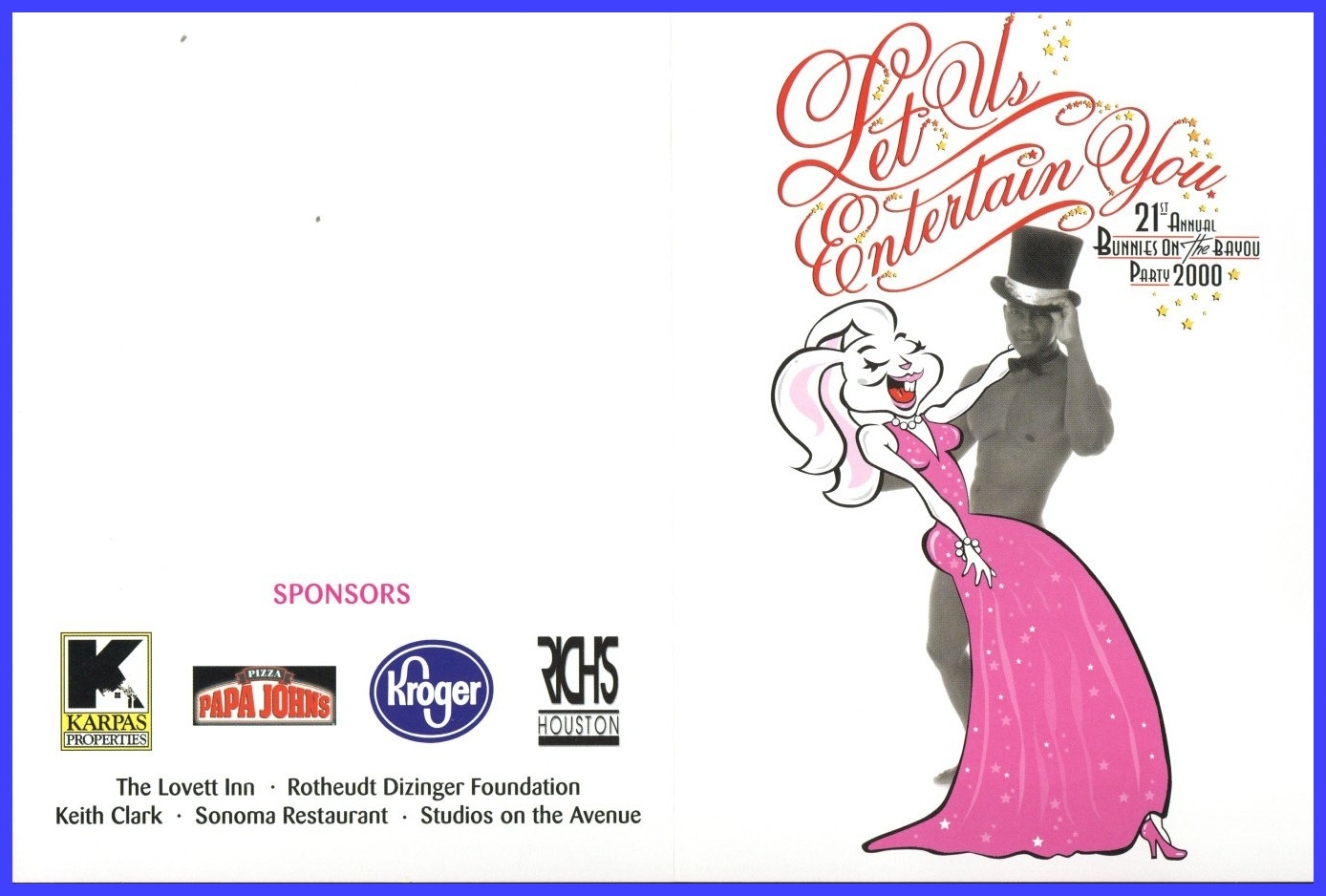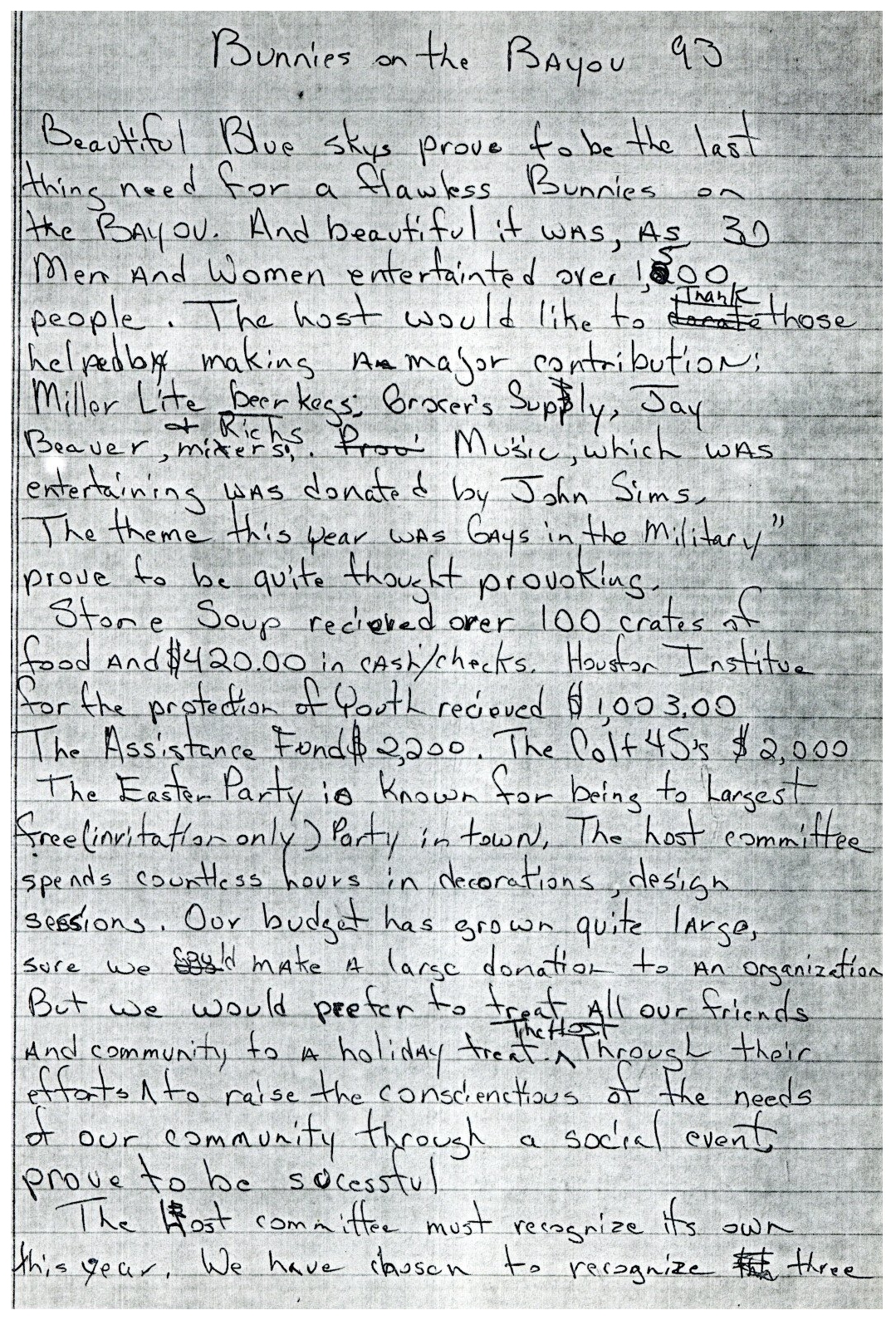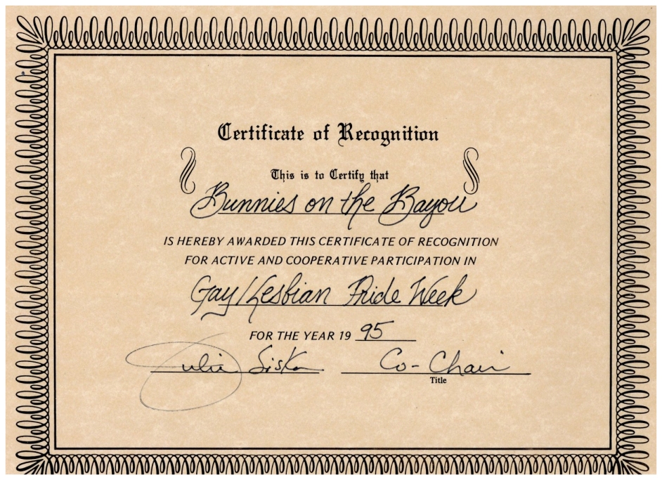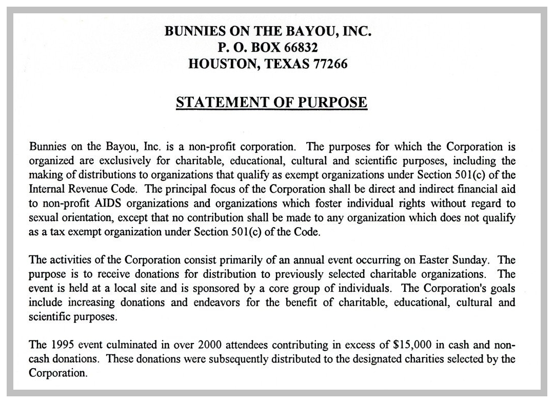 So, here's my history theory... There was a birthday party on Easter Sunday in 1979 at an apartment complex on W Clay. They began having annual parties. In 1981 a group of friends threw a party on Easter they called 'Bunny Fuck,' held for several years. Circa 1984 the first group contacted the second one and got consent to call their party 'Bunny Fuck.' The (private) party was held under that name through 1991. Name changed to Bunnies on the Bayou for 1992, and the group incorporated in 1995. |