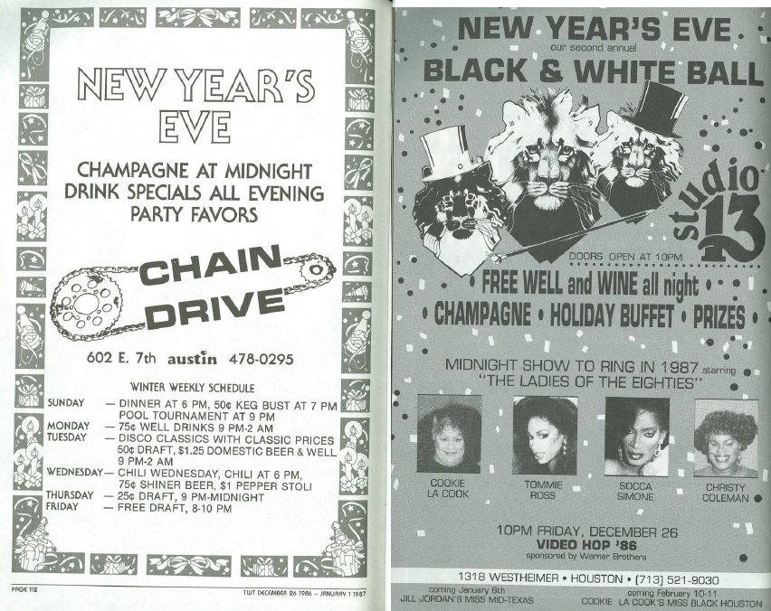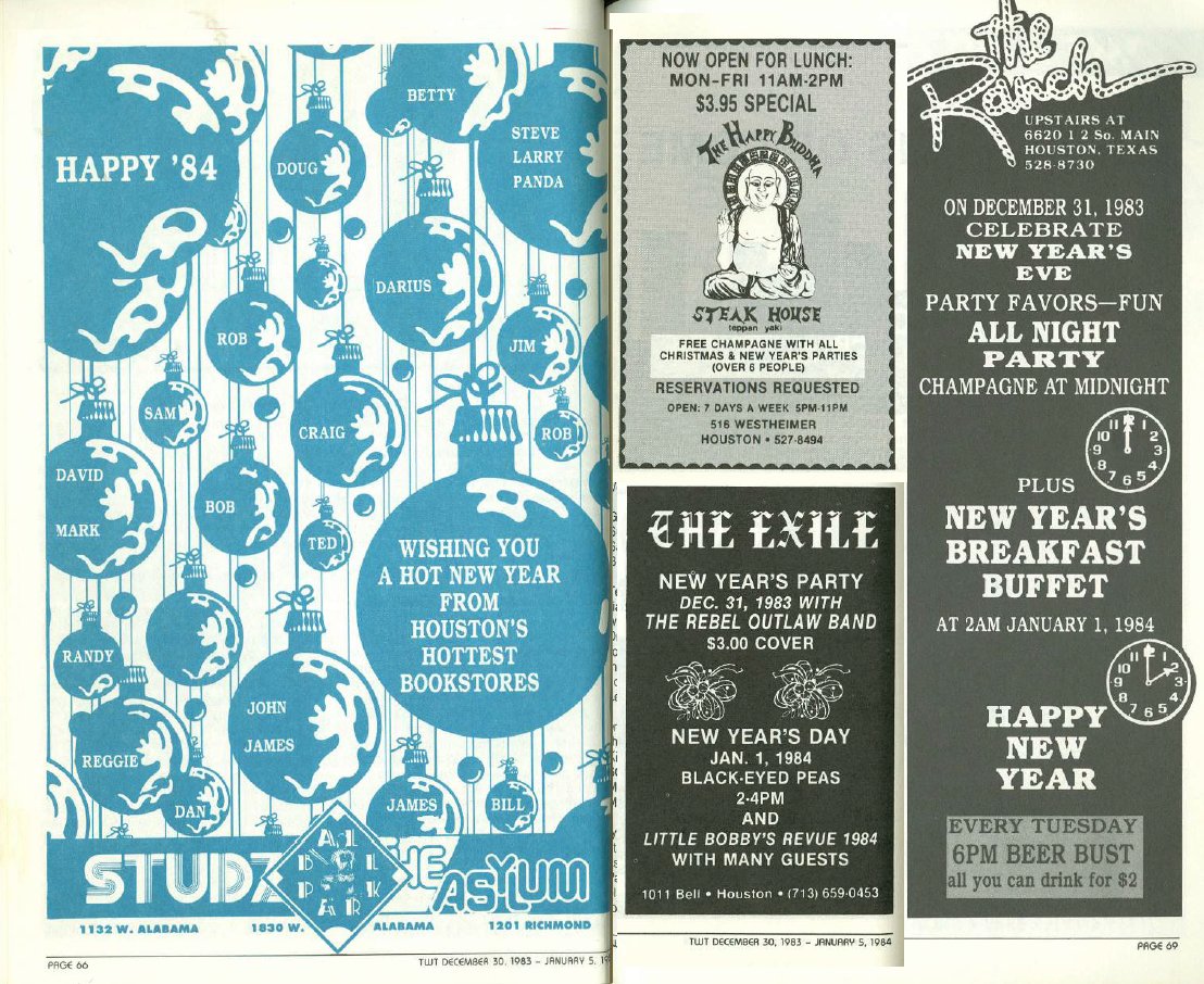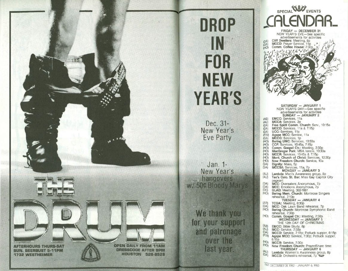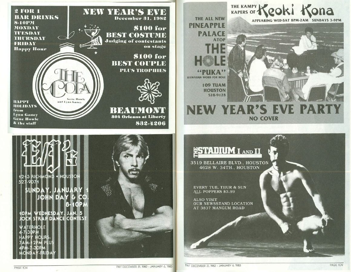 This Week In Texas Ads 1975 - 1983 This Week in Texas Ads 1984 - 1995 TWT Covers Gay Publication Covers Vintage Ads Vintage Photos Cartoons/Comics Rick Chris Holiday Artwork Miscellaneous New Year's Eve
