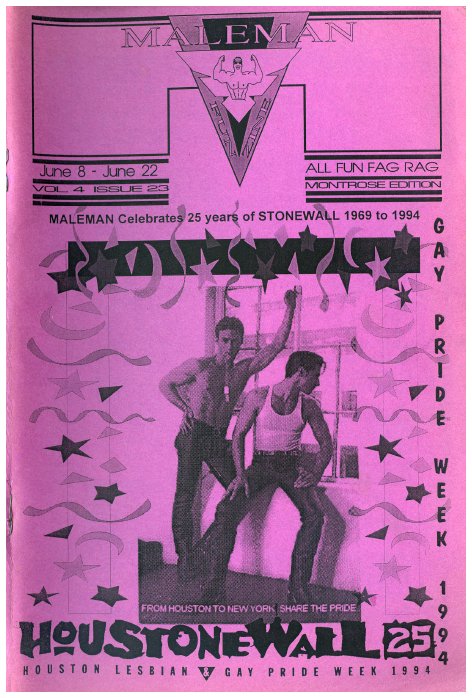 Houston Press (since 1988) is an "alternative" newspaper, rather than a "gay" one, but often had excellent LGBT coverage, such as the extensive features in the issue shown. (Gay content only scanned) Vol 5-25, 6/24/93, PDF Below, critiques of local gay press |