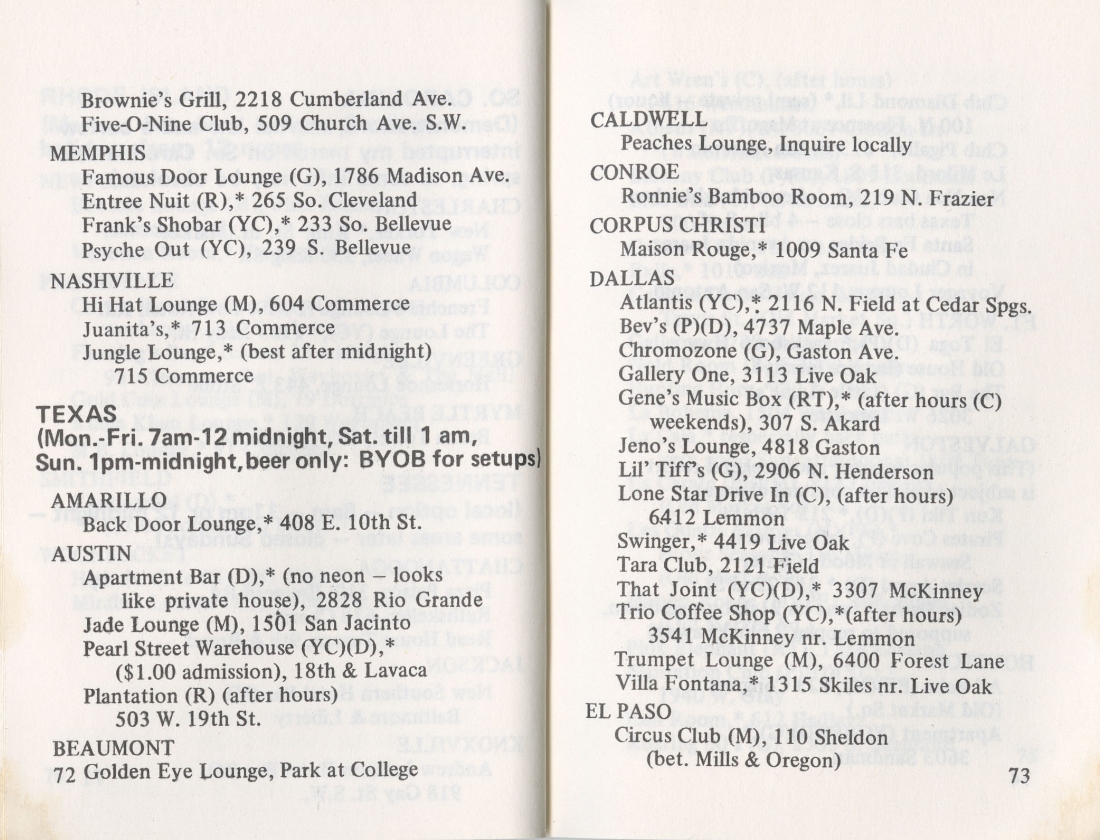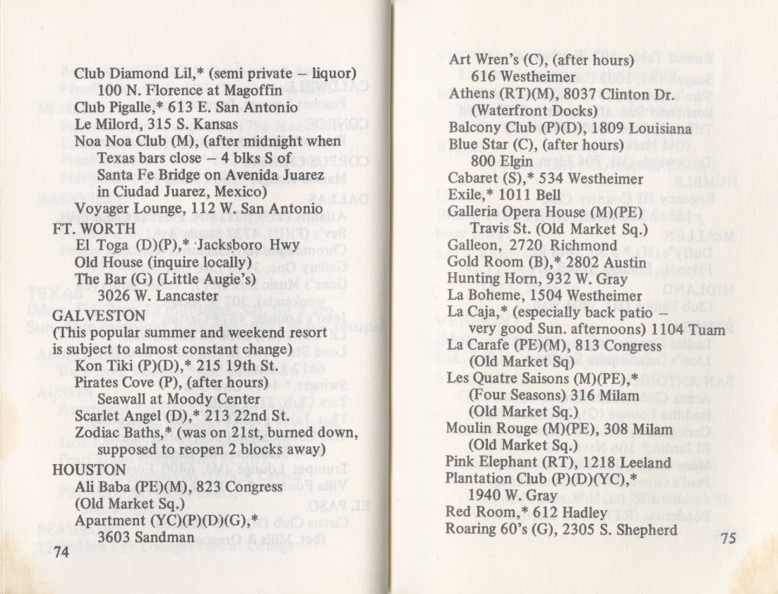 Texas Bars, Baths, Etc from Bob Damron's Address Book 1968 to 1972