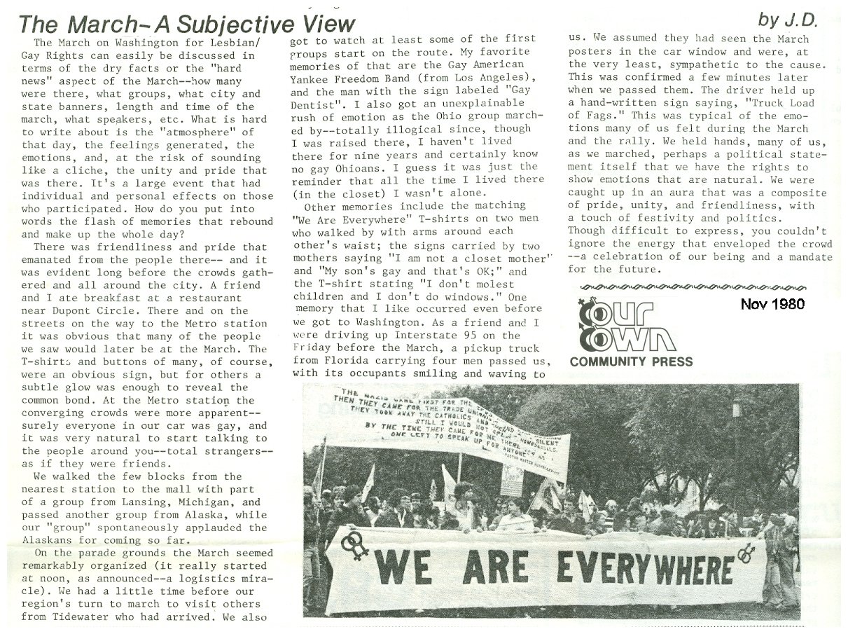 six months, Here are a couple of my favorite articles from Our Own. First is my personal comments on the March on Washington of October 1979.