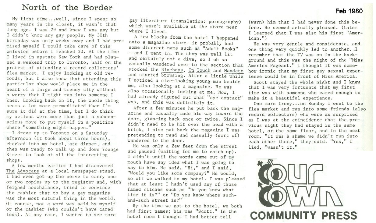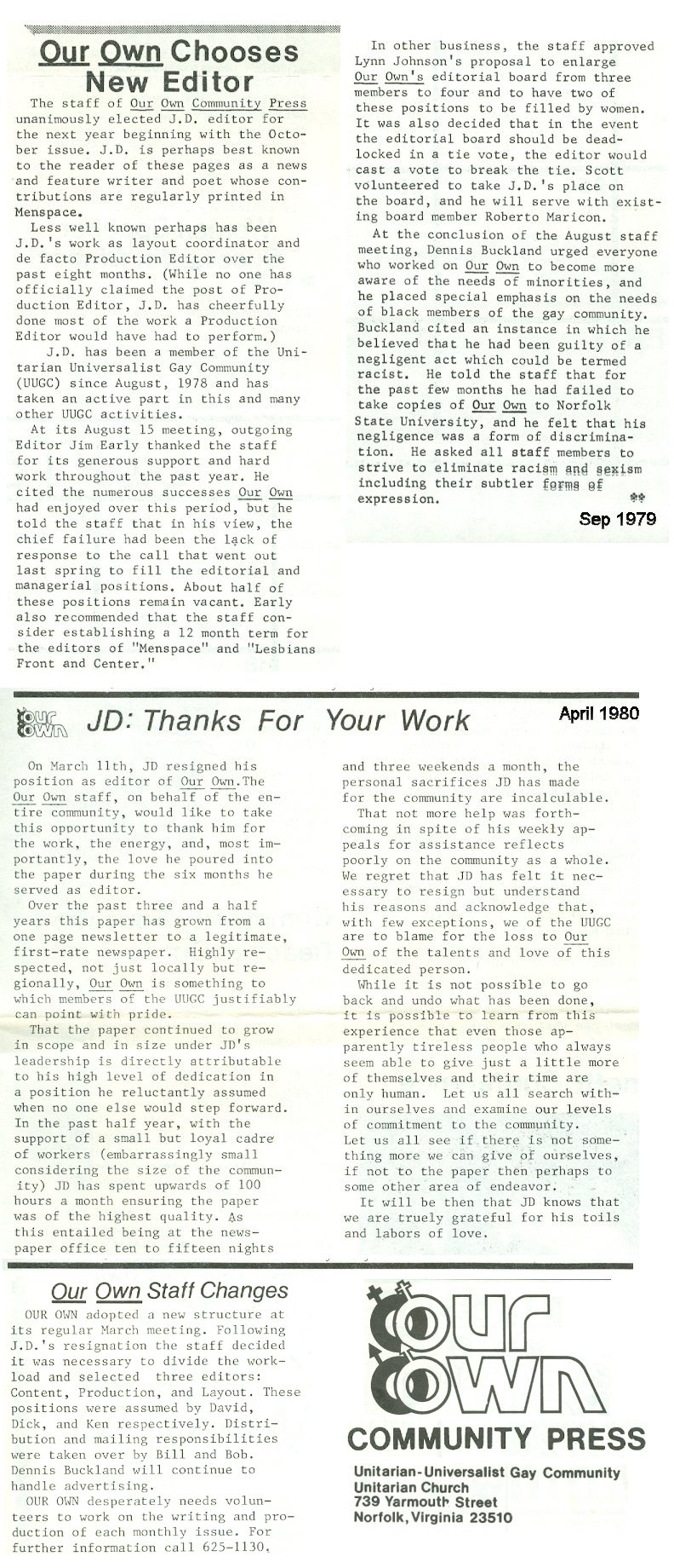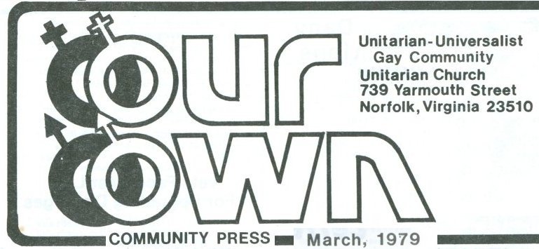 Our Own Digital Library at ODU But I was most involved with the gay newspaper, called Our Own Community Press, and after helping with it for a year found myself accepting the Editor position. Gee, out of the closet for a year and then editor of a gay newspaper, didn't see that coming, a crash course. You know, in volunteer groups you often find yourself doing roles you would not ordinarily do, but as you believe in them getting done, well, you just do it. My work on Our Own turned out to be one of the chapters of my life of which I am the most proud.