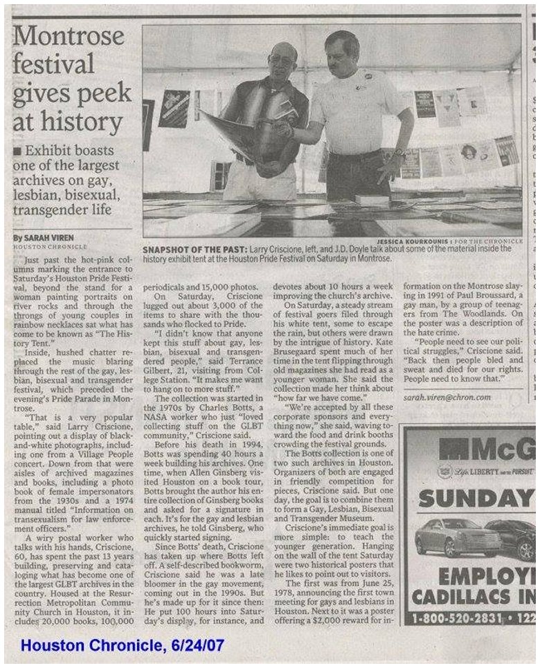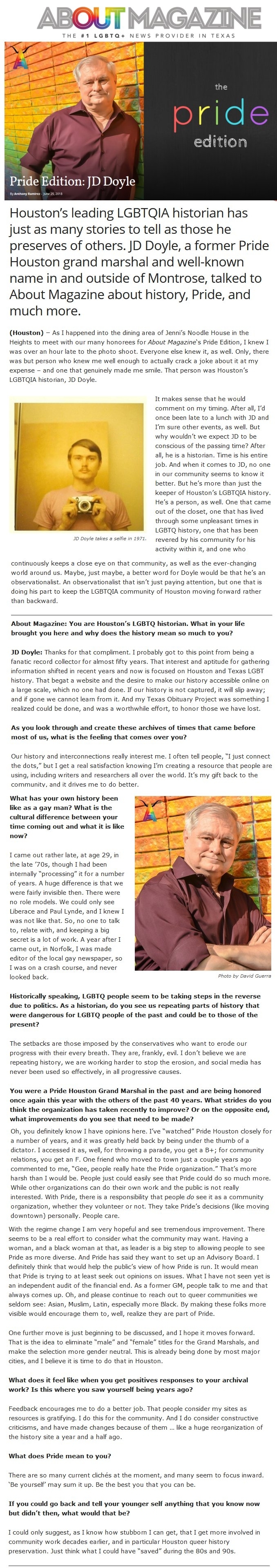 When I first moved to Houston I had taken numerous photos of the Gay Pride Parades, in the early 80s, and wanted to share those. At first I just put them on some pages of the QMH site (well, I already had the site), and then kept adding more and more, until that just didn't make sense anymore, if it ever did. This history needed it's own site, and it's now my main archiving outlet, trying to make our history accessible, especially early gay publications, a huge ongoing effort. This work began in 2013 and is ever growing.