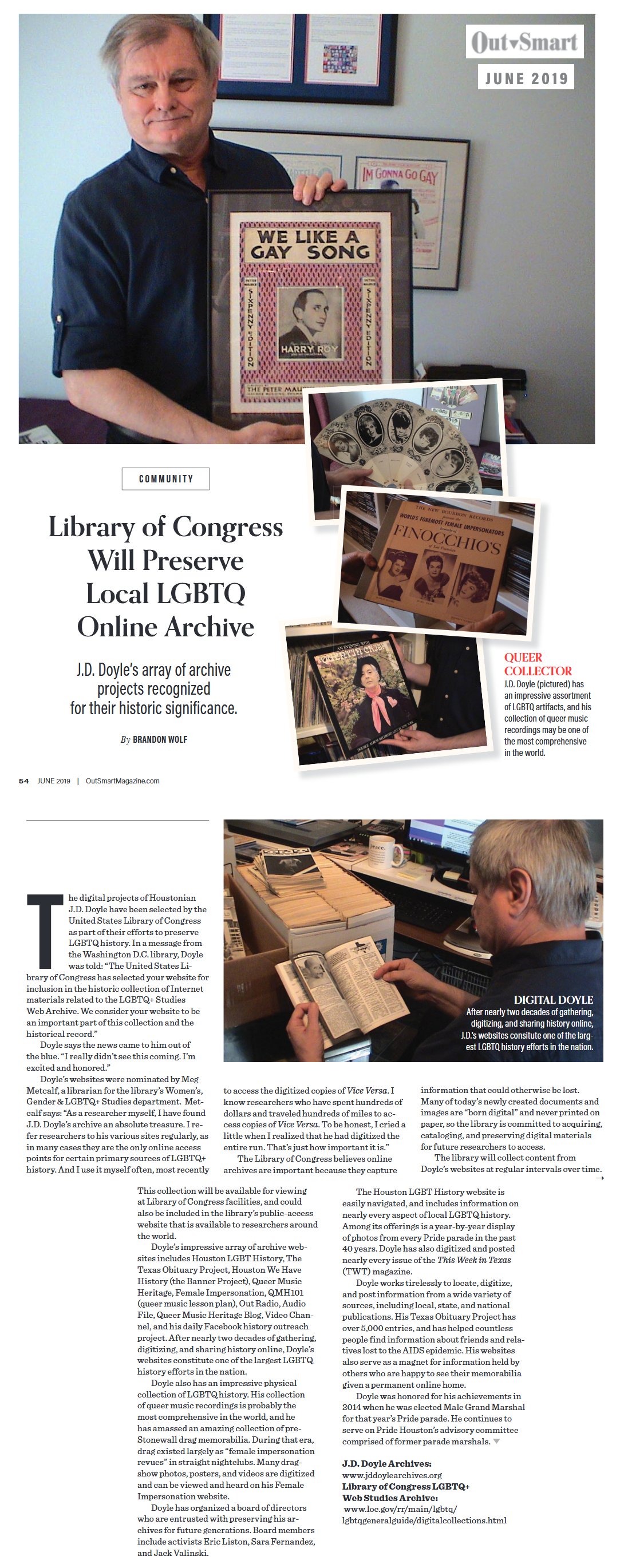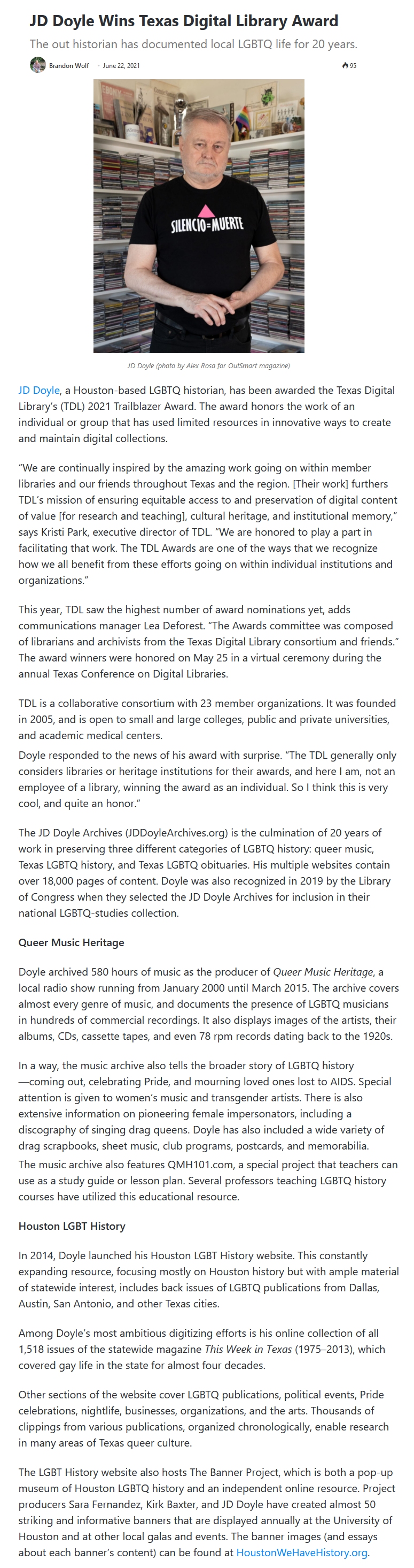 November 2024 Short Version My Archival work began in the 1970s with record collecting, and not with a casual approach...I always studied the data about them. I had many collections over the decades and when I sold one, I always kept the queer stuff. By the end of the 1990s I was invited to do a radio segment on KPFT for Queer Voices. I called it Queer Music Heritage. It began in January 2000, and the goal was to capture and share the music of our past in a lot of genres. Always high on my gay agenda was to feature lyrically gay/lesbian/transgender music, because that could not be heard on the radio. Our lives and stories needed to be out there. That program ended after 15 years, and every show is archived. After 15 years I wanted to move on to other areas, and in 2014 I began the History and Obituary sites. The History site covers many aspects important to our community, but I think my favorites are Publications, Politics and Pride. I have digitized many thousands of publications that previously could not be found online. And my Texas Obituary Project honors those LGBT Texans we have lost, a total of over 8200 pages, so far. They are both huge sites and my three sites total almost 22,000 pages of content. And I'm not done.