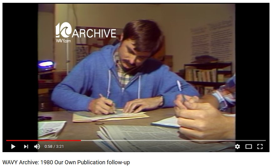 Oh, yeah, this happened.... Way Back in 1980, when I had just finished my stint as Editor, the paper found itself embroiled in a white hot controversy. We were distributed in all the bars, many restaurants and logical places, and also in the Virginia Beach Library. That was when the bible bigots thought that was unacceptable. It turned into an ACLU lawsuit and we could not have bought all the publicity we got. Across the country people knew Norfolk had a gay newspaper. Oh, the ultimate compromise was to have non-distribution copies if you asked to read them at the desk. But it made the local newscasts, and a friend (Thanks Jerry Halliday) just found one that I was in, gosh, only 3 seconds (at the 0:56 mark) but cool! I remember being in another, taken at a City Council meeting. Click to View or the actual file, Here