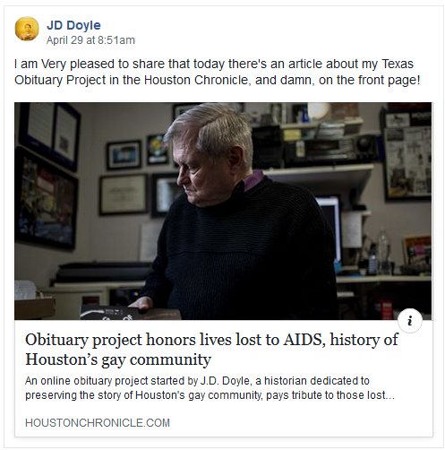 In 2012 I got inspiration from a website in San Francisco that was a searchable database of all obituaries to appear in the Bay Area Reporter. I felt we needed a site like that for Texas, and tried to get members of a local history group to take up the project. After about a year I got tired of waiting for that to happen and decided to just do it myself, and did, gathering data mostly from the publication This Week in Texas, but also from what other early publications I could find. I started building the site, and data collection, in September 2013 and it was ready to launch in February 2014, and currently (as of September 2016) has over 5275 pages, meaning it has that many obituaries of LGBT people we have lost. This project is especially gratifying because it takes on a very personal aspect, in giving many people a sense of closure. I have received many, many emails thanking me for having their loved one's obituaries, many of which they could find no where else. The data also incorporates searchable "tags," including not only the city in which they lived, but also identifiers like black, latino, female, drag, violence and AIDS, providing a useful tool for researchers.