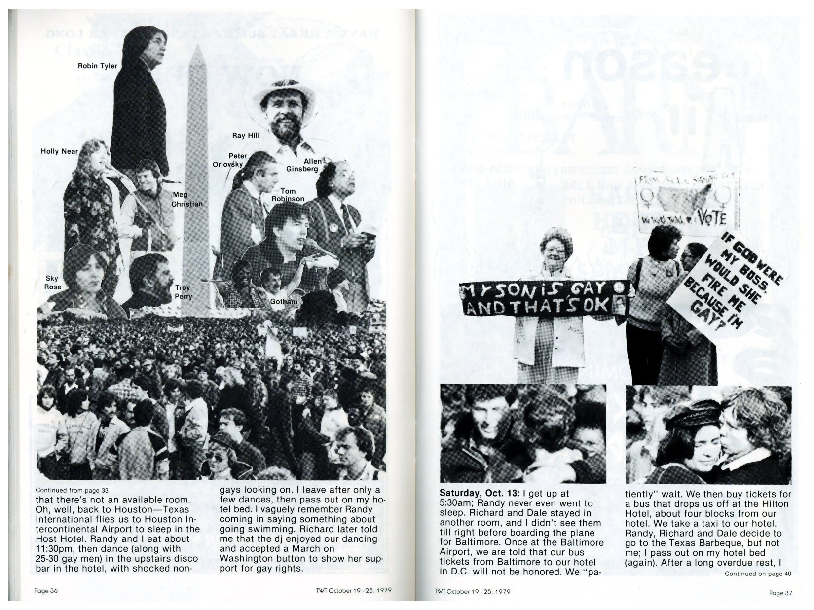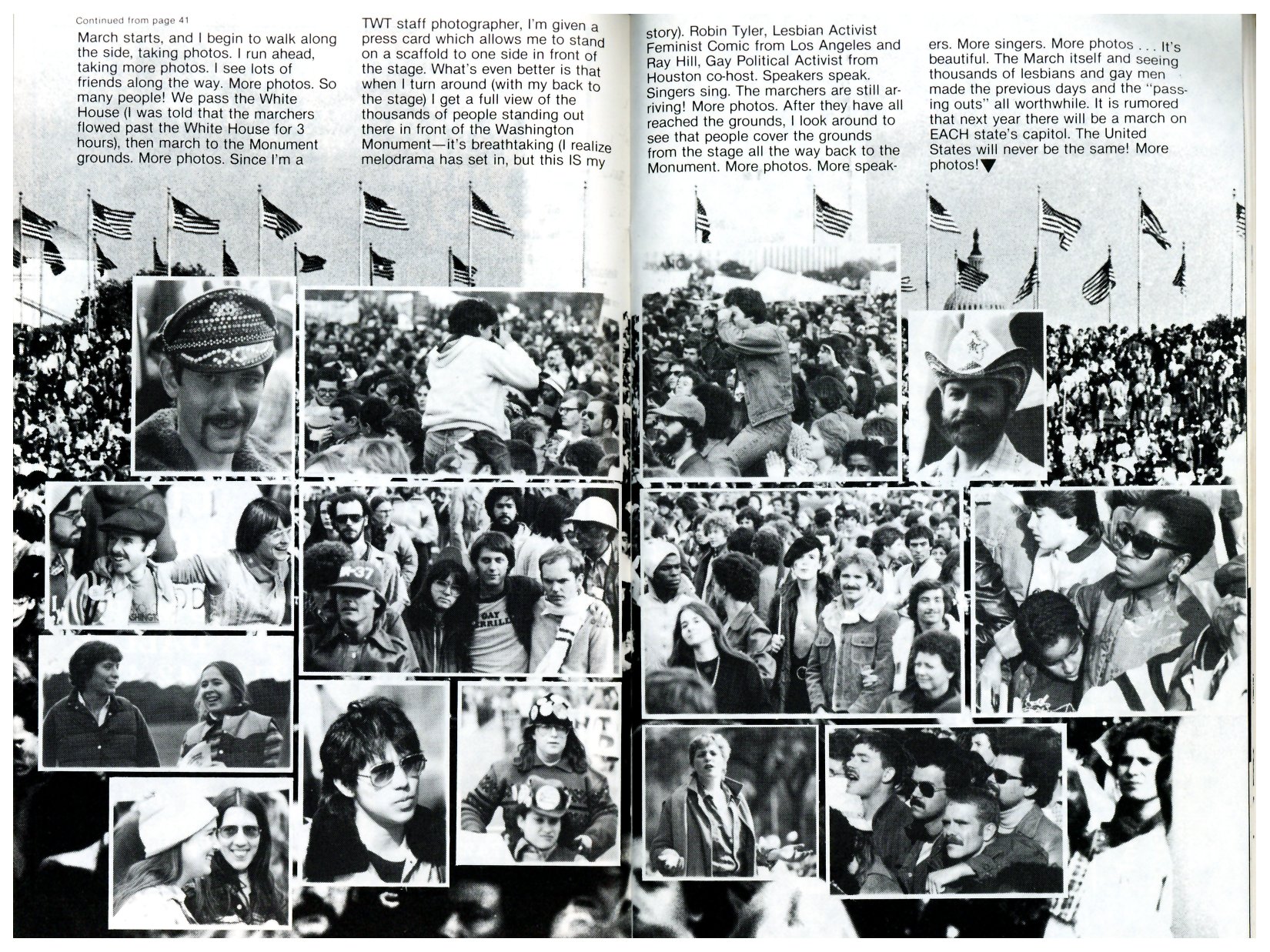 The Day of the March - Houston Contingent Getting Organized The March on Washington - Part 1, Houston The March on Washington & Rally - Part 2, Los Angeles The March on Washington - Part 3- Everyone else The March on Washington - Part 4 - More Everyone Else The pre-March Rally, the day before Ray Hill & Houston Rally Shots Robin Tyler & Maxine Feldman Holly Near & Meg Christian Blackberri Gotham Allen Ginsberg & Peter Orlovsky Casselberry & Dupree, and Mary Watkins Kate Millett and Charles Law Rally Crowd Shots Other Speakers/Performers Misc--Houstonians at the Hotel Color Photos Photos I took of the MOW