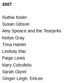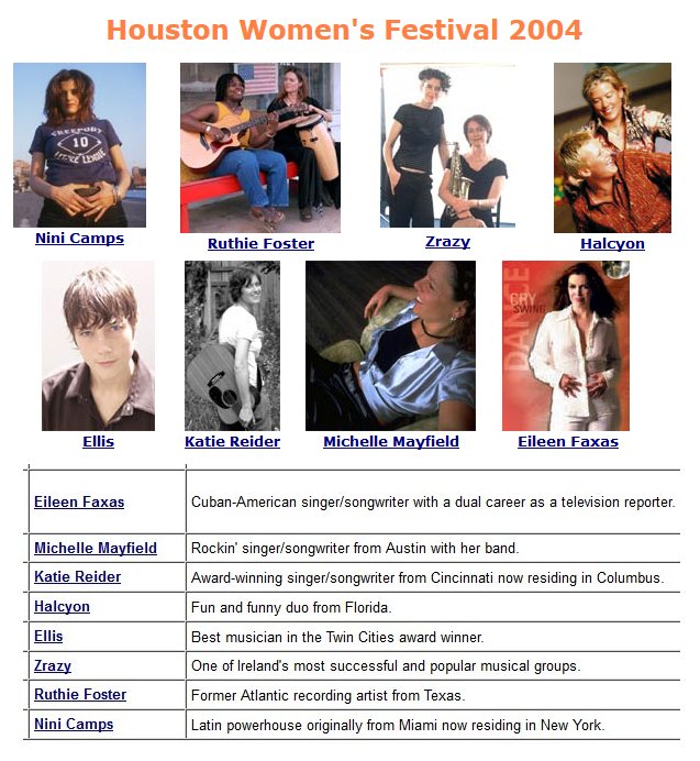 Eileen Faxas, Michalle Mayfield, Katie Reider, Halcyon, Ellis, Zrazy, Ruthie Foster, Nini Camps