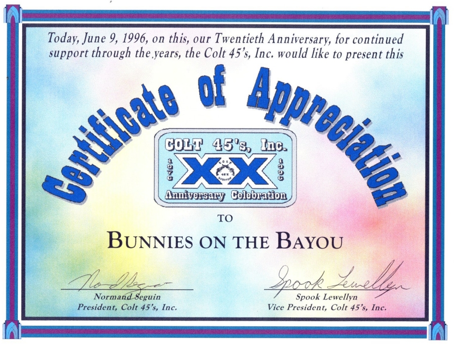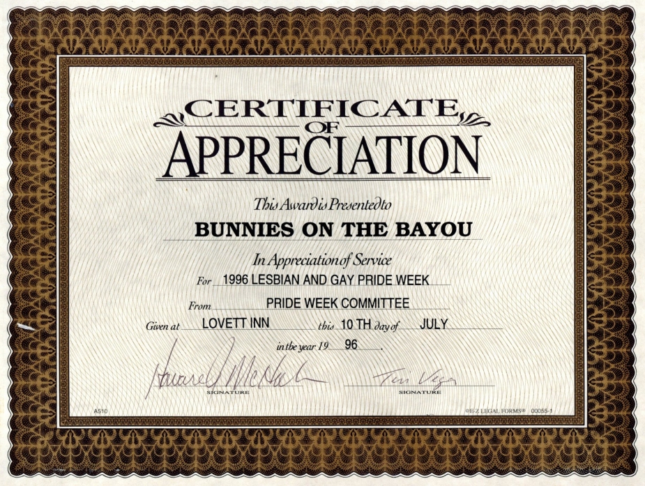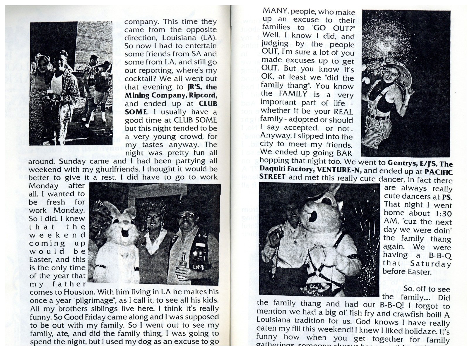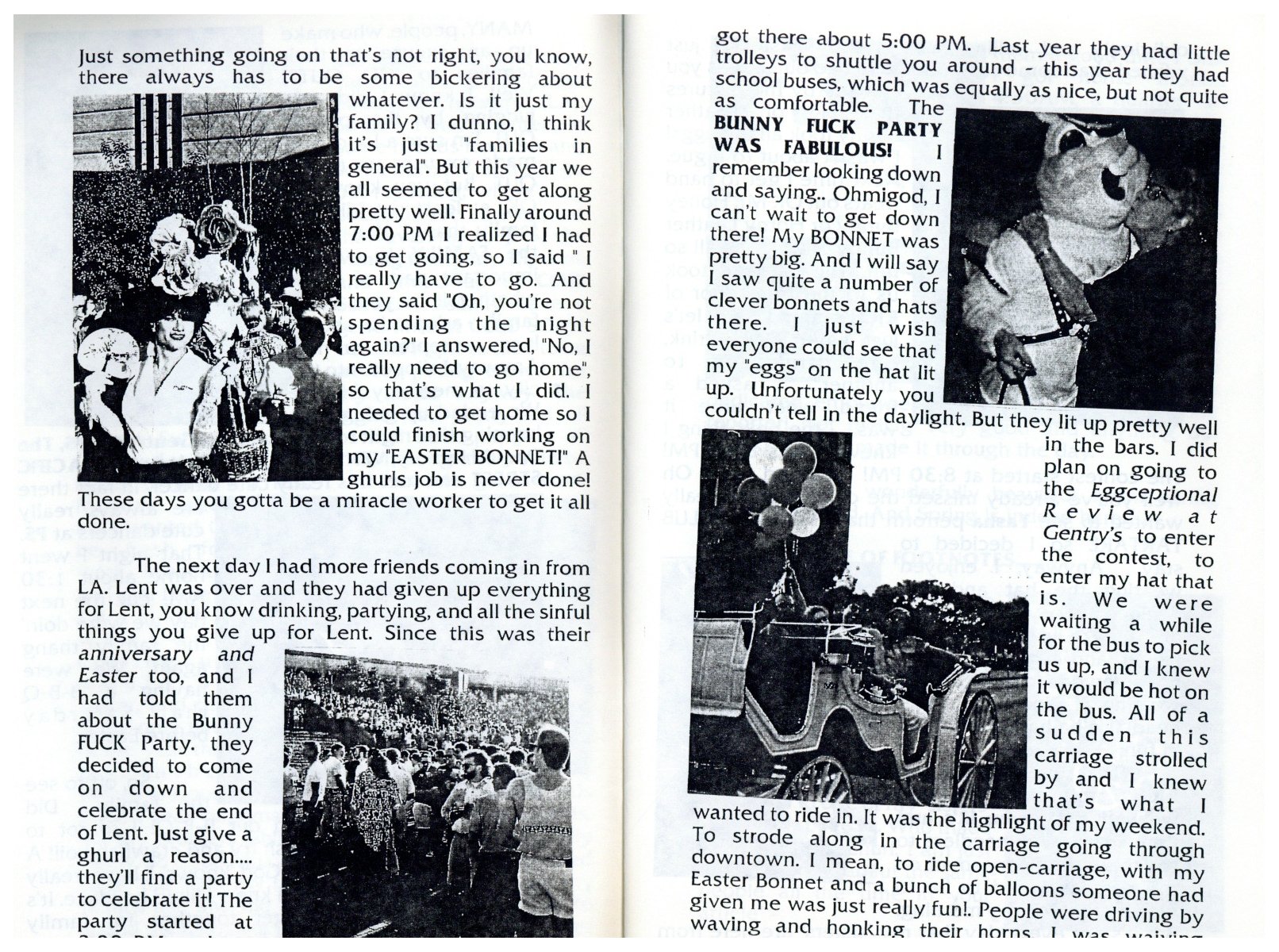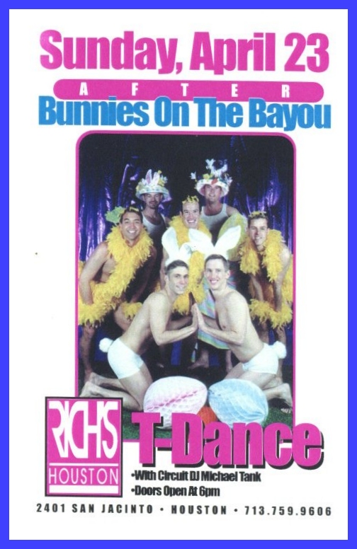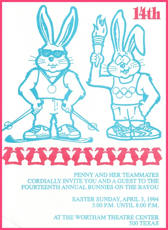So, here's my history theory... There was a birthday party on Easter Sunday in 1979 at an apartment complex on W Clay. They began having annual parties. In 1981 a group of friends threw a party on Easter they called 'Bunny Fuck,' held for several years. Circa 1984 the first group contacted the second one and got consent to call their party 'Bunny Fuck.' The (private) party was held under that name through 1991. Name changed to Bunnies on the Bayou for 1992, and the group incorporated in 1995. |