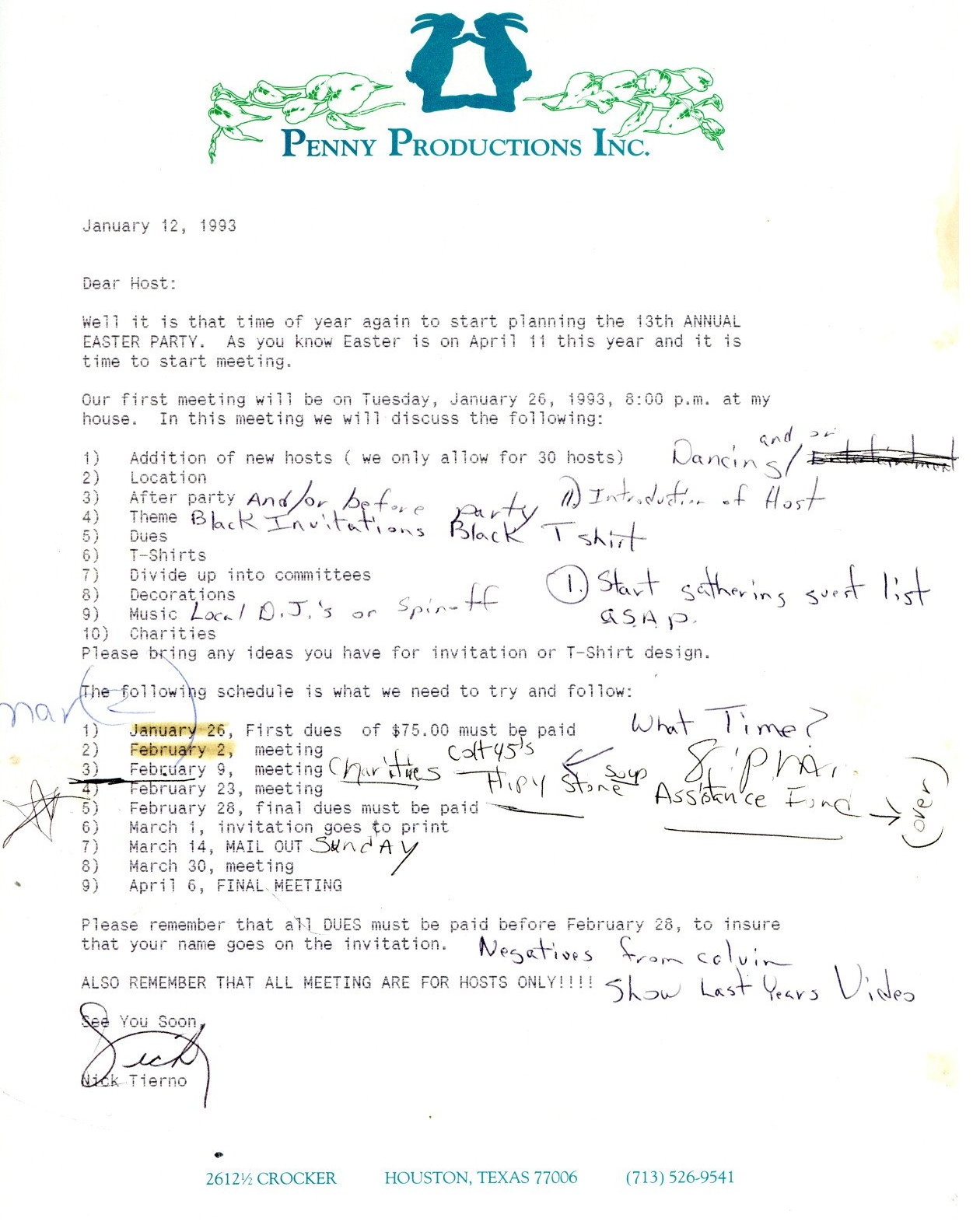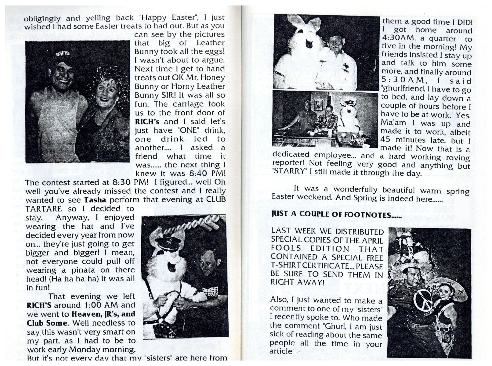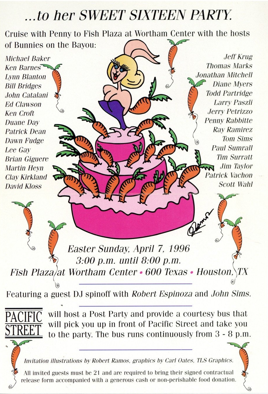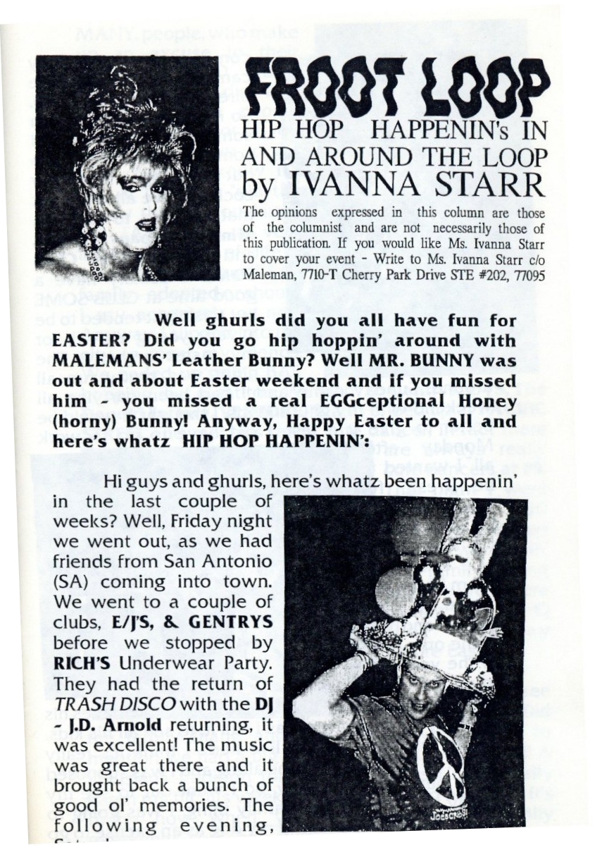 So, here's my history theory... There was a birthday party on Easter Sunday in 1979 at an apartment complex on W Clay. They began having annual parties. In 1981 a group of friends threw a party on Easter they called 'Bunny Fuck,' held for several years. Circa 1984 the first group contacted the second one and got consent to call their party 'Bunny Fuck.' The (private) party was held under that name through 1991. Name changed to Bunnies on the Bayou for 1992, and the group incorporated in 1995. |