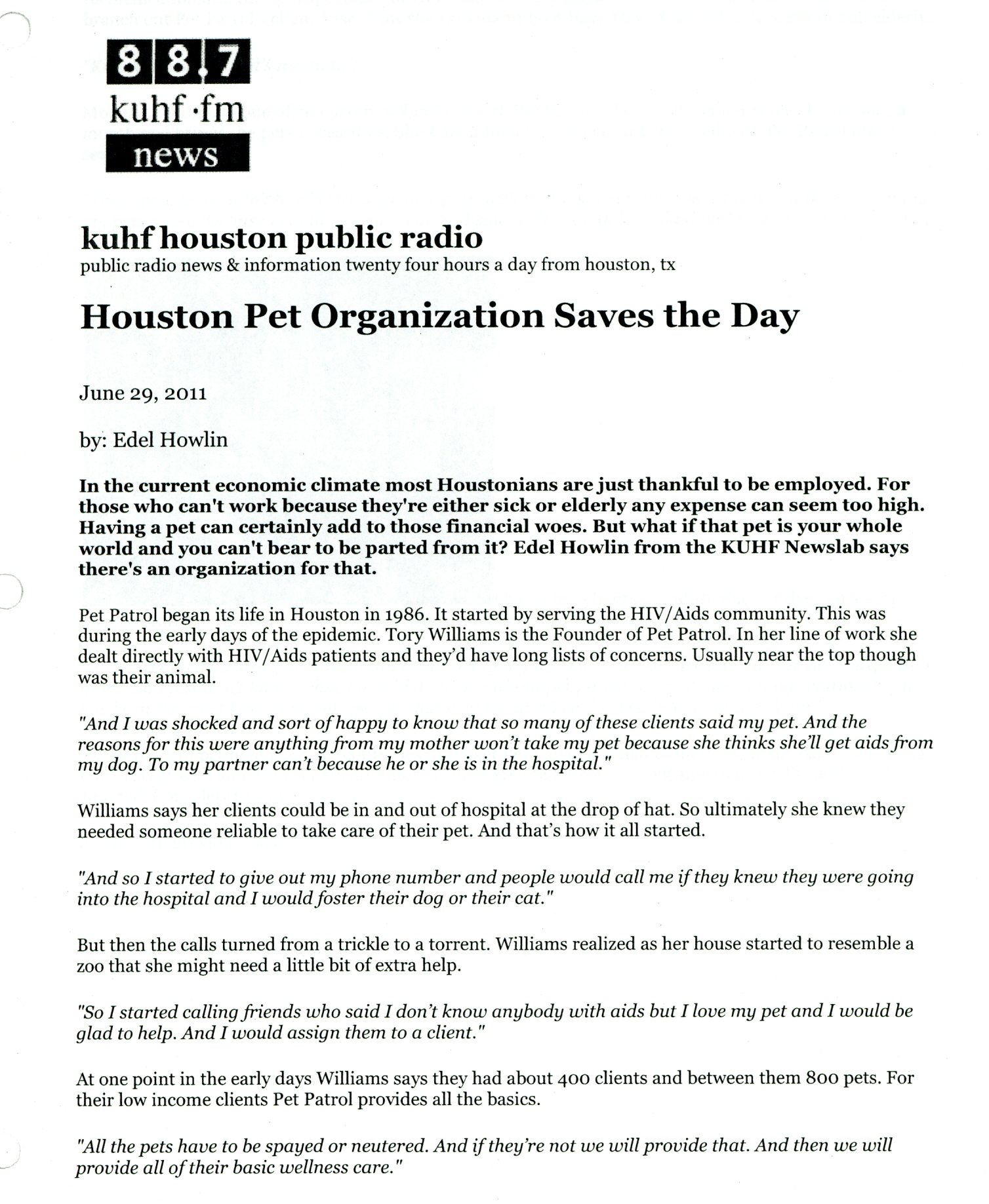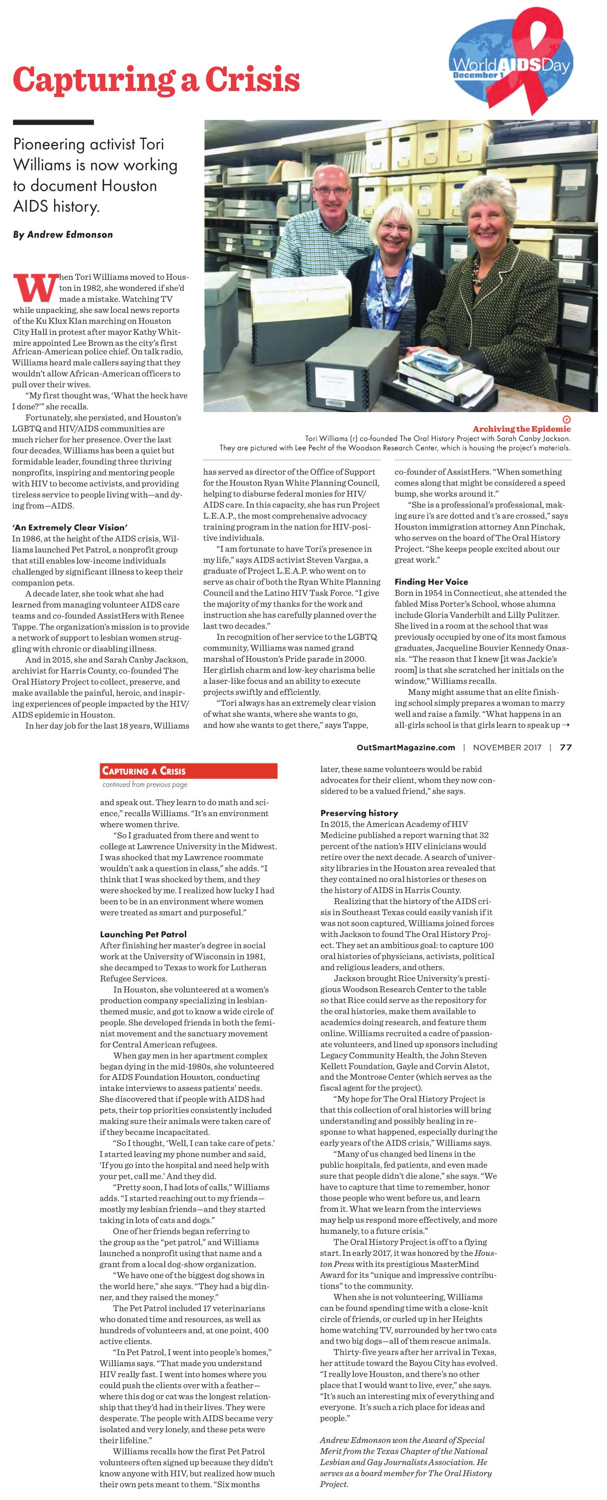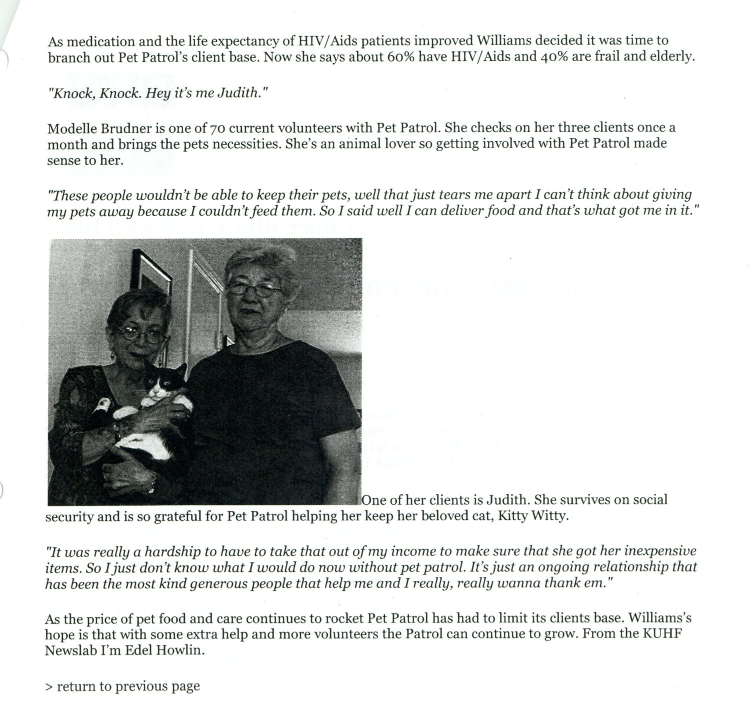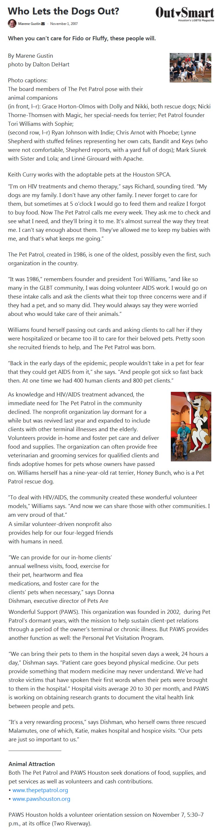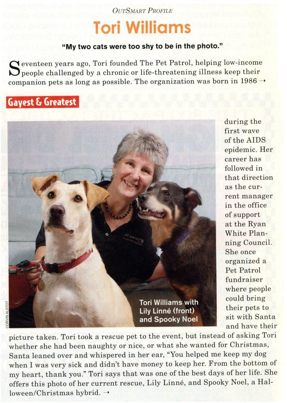 update article on Tori Williams, including Pet Patrol history, November 2017