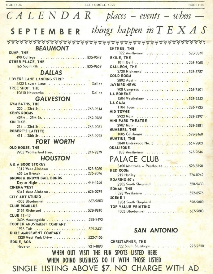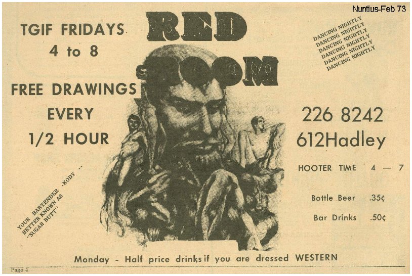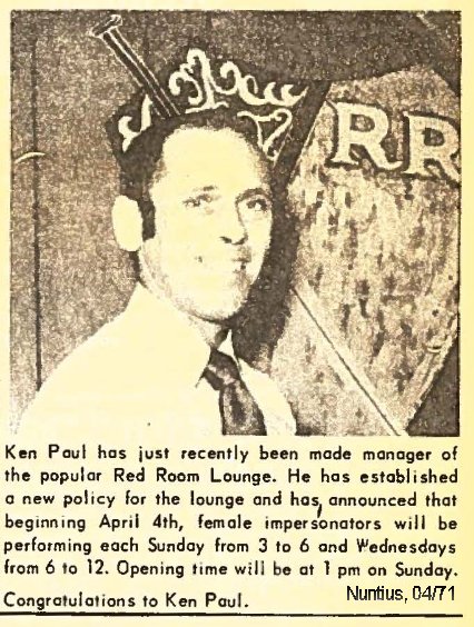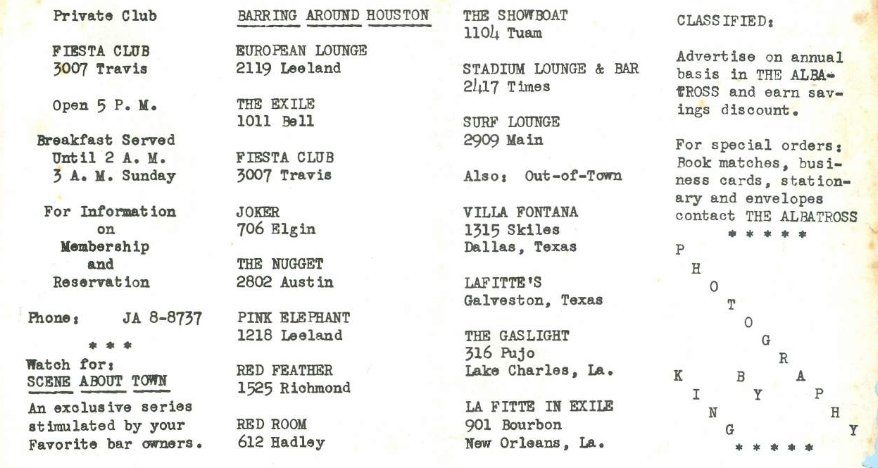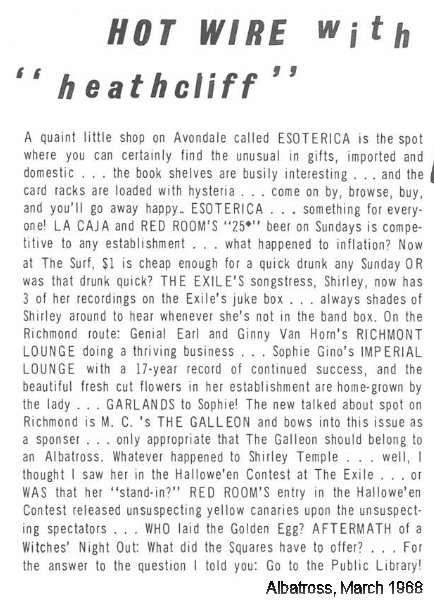 early bar listing from the Albatross, 8/18/65, including the Red Room. Cole's Directory for 1965 shows the Red Room